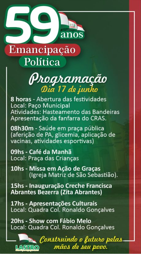 A cidade do Lastro completará 59 anos de emancipação nesta sexta-feira (17), e o prefeito Dr. Athaíde Diniz (Cidadania) irá realizar uma vasta programação festival para os munícipes.