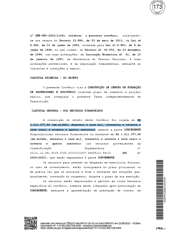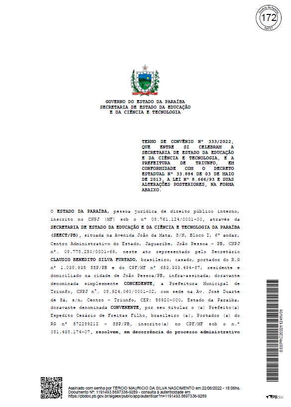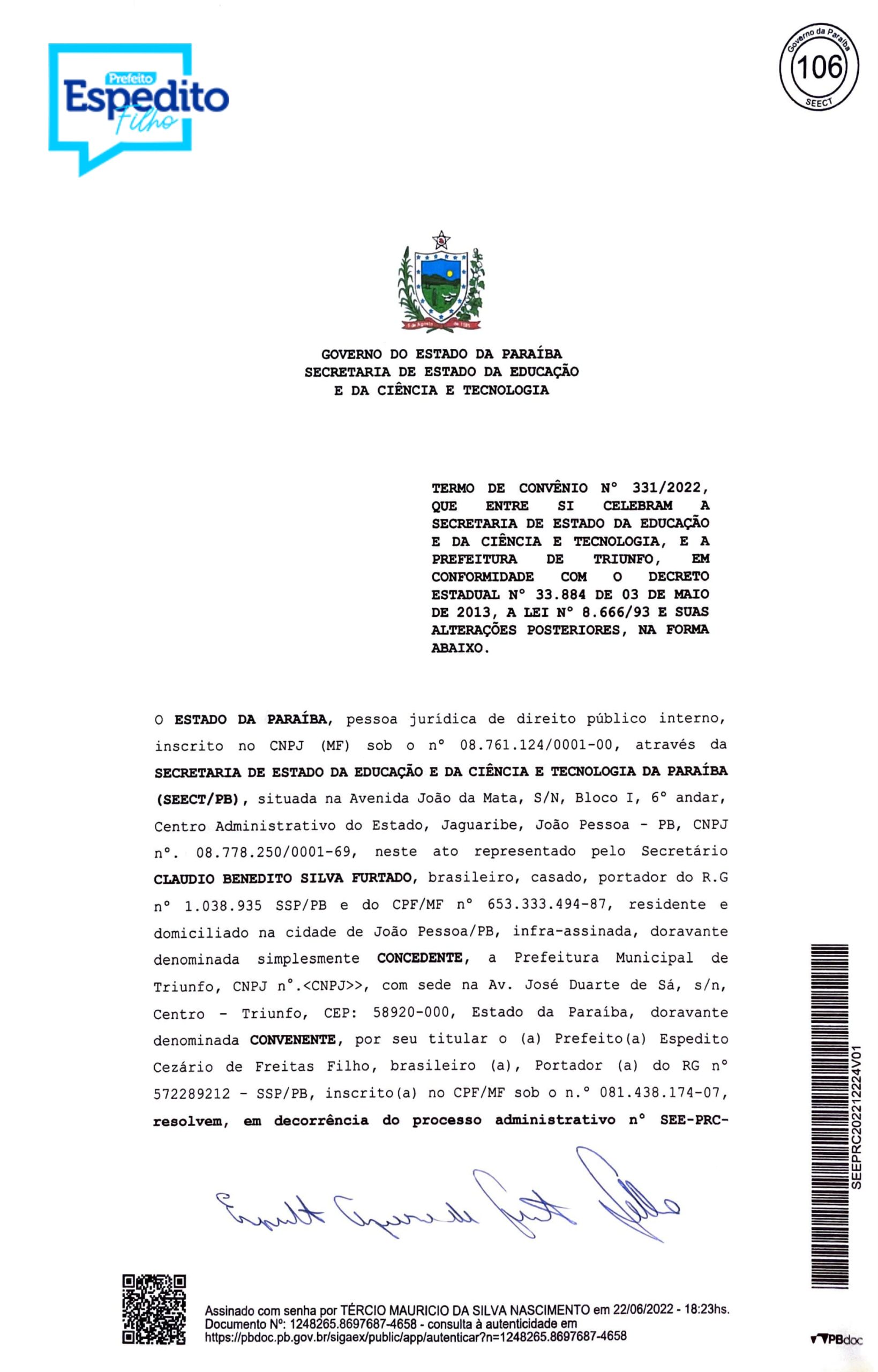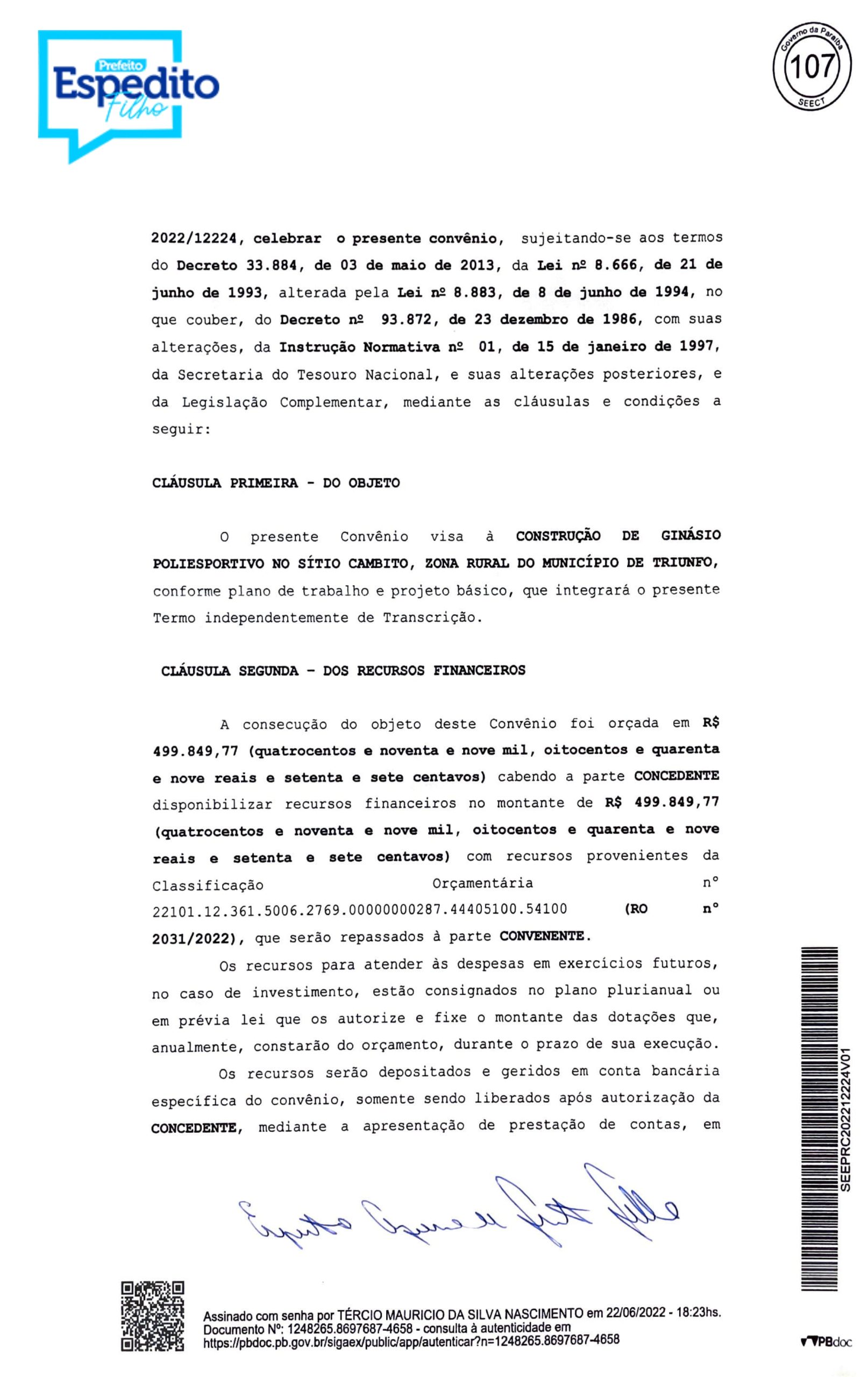 Nesta terça-feira (28), o prefeito Espedito Filho (PP) assinou o termo de convênio com o governo da Paraíba, através da Secretaria de Estado da Educação e da Ciência e Tecnologia da Paraíba, que contempla o sítio Cambito com um Ginásio Poliesportivo no valor de R$ 500.000,00 (quinhentos mil reais).