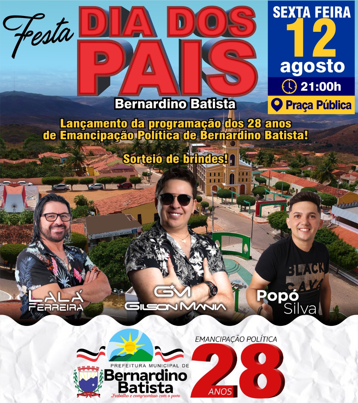 Nesta sexta-feira (12), a prefeitura de Bernardino Batista realizará gratuitamente a festa do Dia dos Pais em praça pública com as seguintes atrações: Popó Silva, Lalá Ferreira (ex mastruz com leite) e Gilson Mania.
