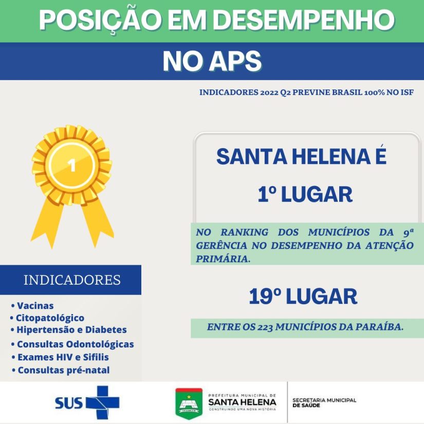 A cidade de Santa Helena ficou em 1º lugar no ranking dos municípios da 9ª gerência e 19º lugar entre os 223 municípios da Paraíba. A posição é decorrente do desempenho no APS, indicadores 2022 Q2 Previne Brasil.