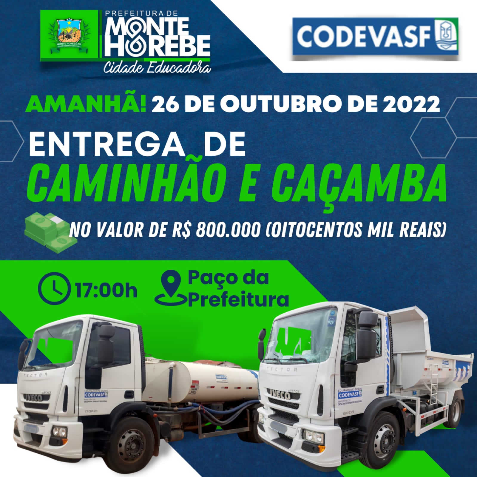 O prefeito Marcos Eron anunciou que a entrega dos veículos será realizada nesta quarta-feira (26), às 17h, no Paço da Prefeitura de Monte Horebe.