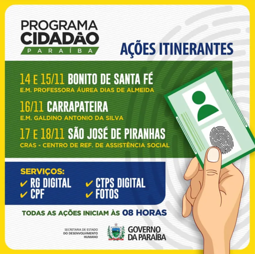 O Programa Cidadão, através da parceria entre o Governo do Estado e a Prefeitura de São José de Piranhas, através da Secretaria municipal do Trabalho e Ação Social, leva nestas quinta (17) e sexta-feira (18), a oportunidade para a população retirar documentos gratuitamente.