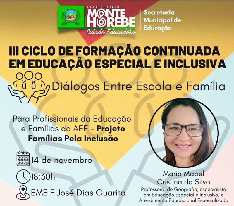 A Prefeitura de Monte Horebe, através da Secretaria Municipal de Educação, realizou no dia 14 de novembro o “III Ciclo de Formação Continuada em Educação Especial e Inclusiva: Um Diálogo Entre Escola e Família”, com a formadora prof. Maria Mabel.