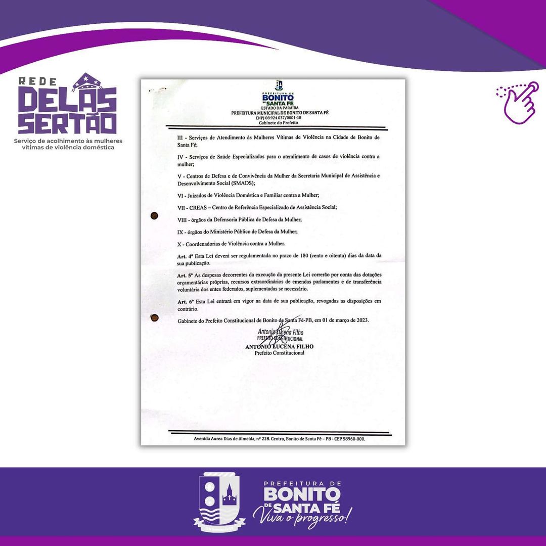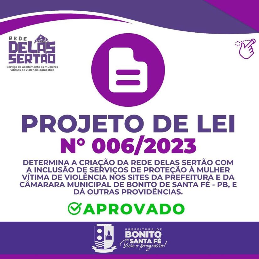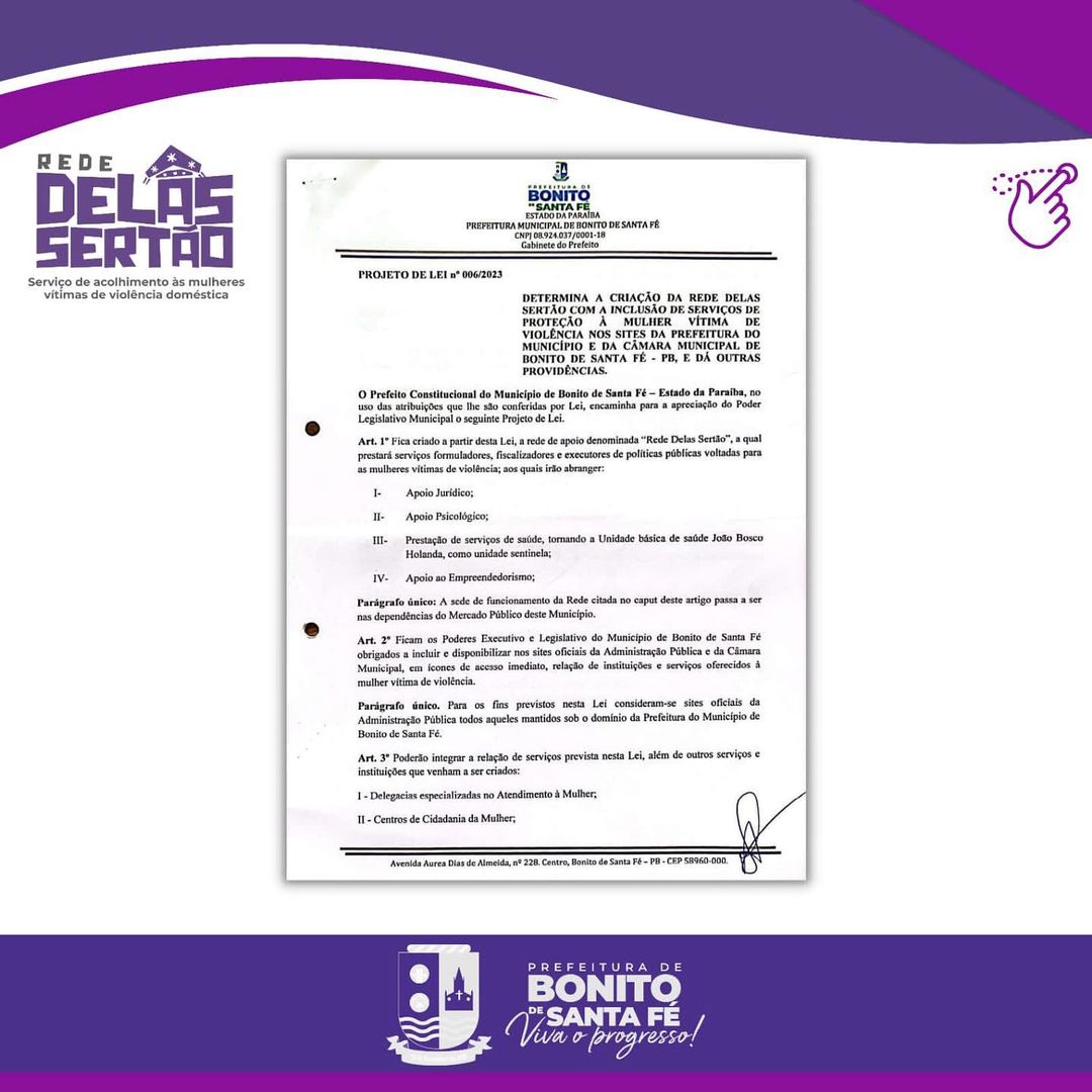 Nesta sexta (10), a Câmara de vereadores de Bonito de Santa Fé aprovou por unanimidade o projeto “Rede Delas Sertão” proposto pelo prefeito Ceninha Lucena. O projeto visa oferecer apoio jurídico, psicológico e social para mulheres vítimas de violência doméstica.