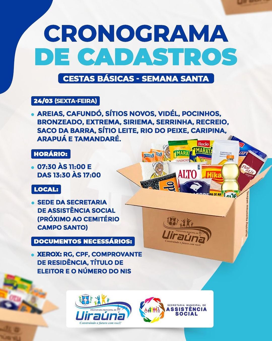 Prefeitura de Uiraúna anuncia cronograma de distribuição de cestas básicas para a Semana Santa