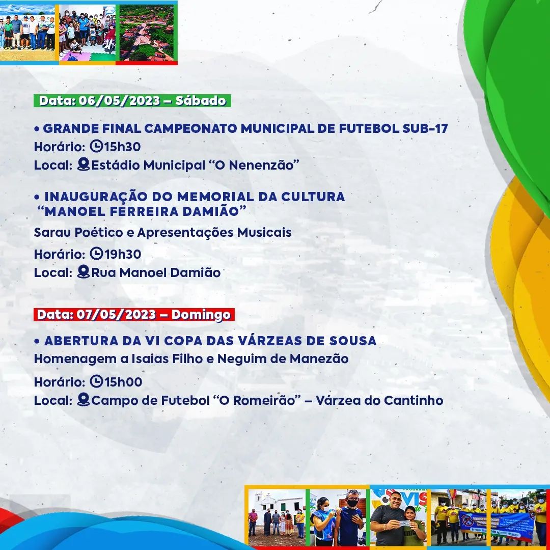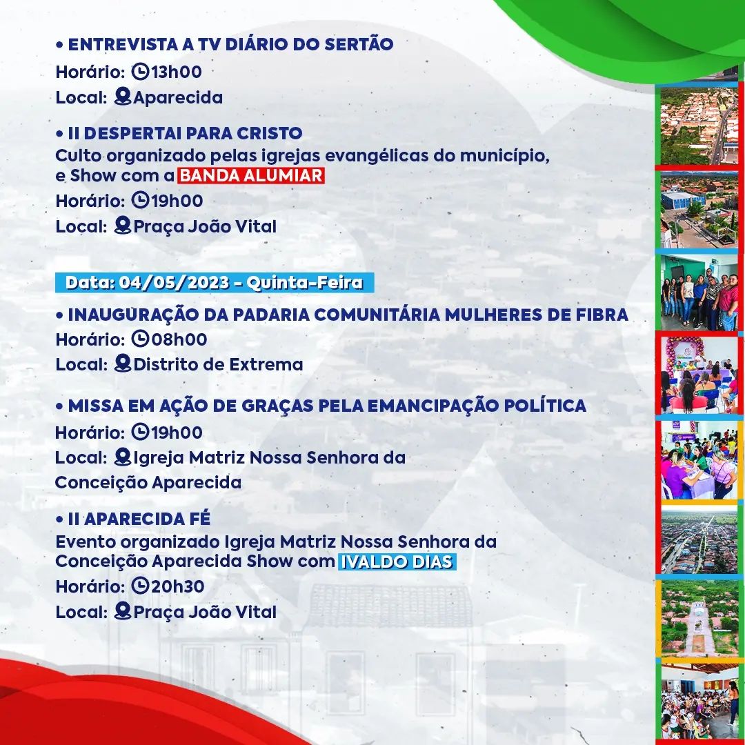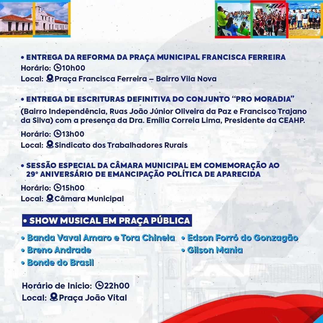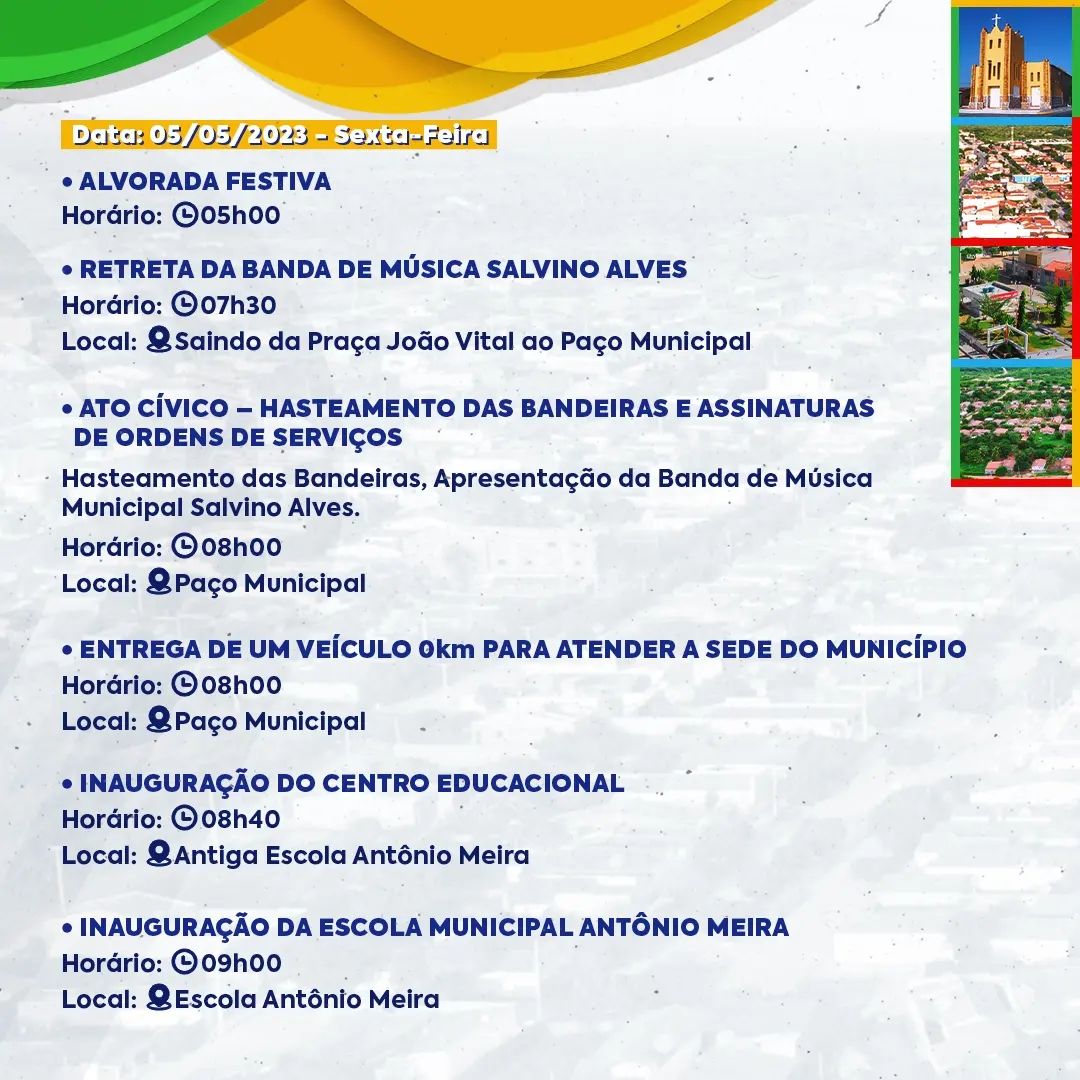 Além de várias inaugurações, campeonatos, entrega de importantes equipamentos e benefícios para a população, no dia 05 acontecerá um show em praça pública com as seguintes atrações: Vaval Amaro e Tora a Chinela, Breno Andrade, Bonde do Brasil, Edson Forró do Gonzagão.