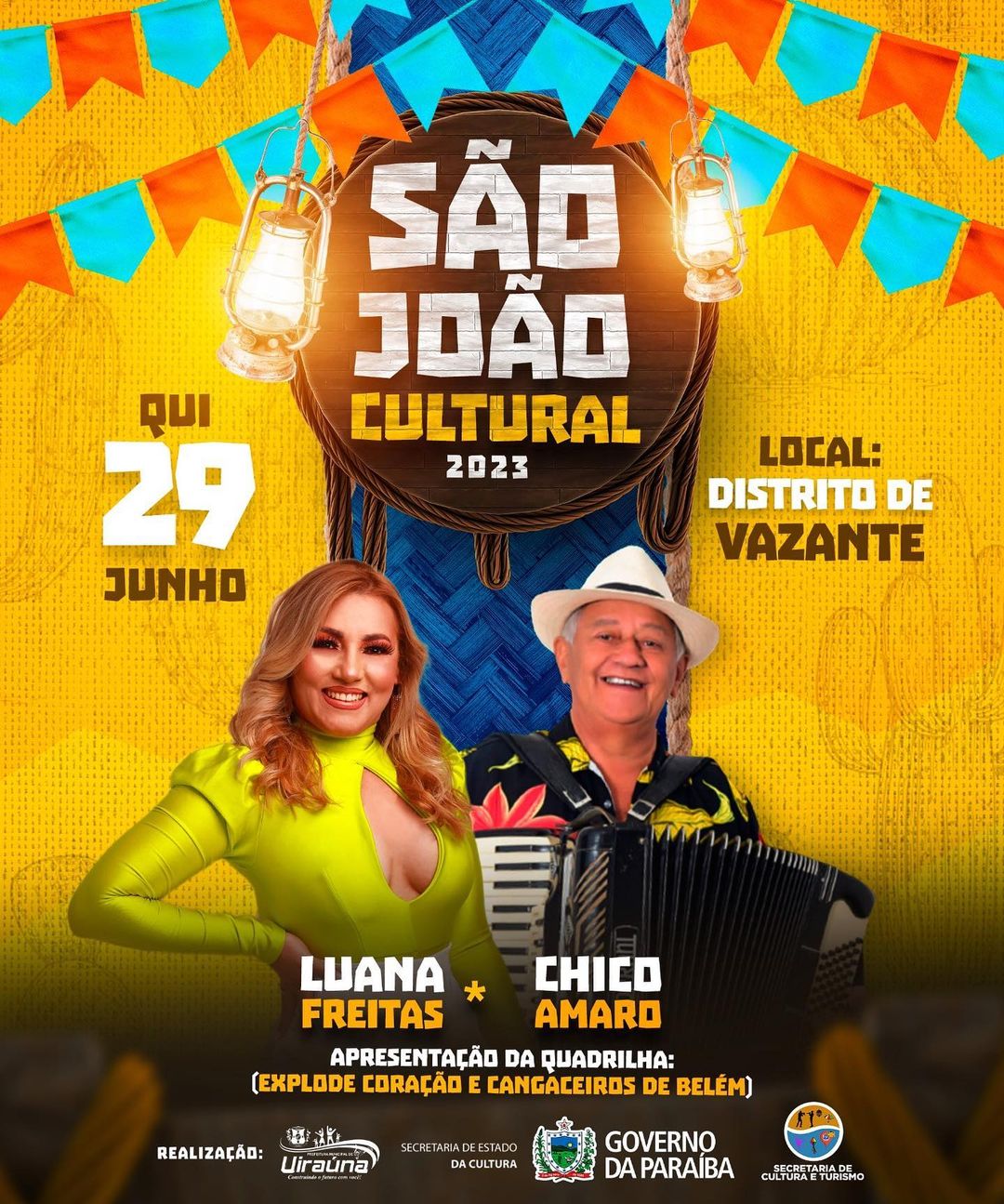 – Dia 29 de junho, atrações confirmadas: Luana Freitas e Chico Amaro; apresentação das quadrilhas Explode Coração e Cangaceiros de Belém; local: Distrito de Vazante.