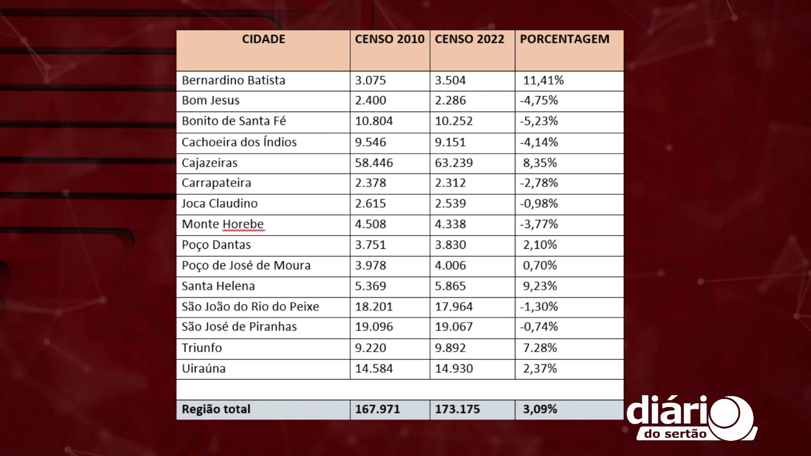 Na região de Cajazeiras, no Sertão do estado, composta por 15 municípios, houve um aumento de 3,09% da população geral. Em 2010, a população dessa região era de 167.971. Em 2022 aumentou para 173.175 habitantes.