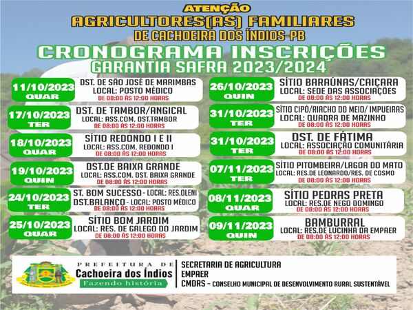 A prefeitura de Cachoeira dos Índios informa que o cadastro do Programa Garantia Safra 2023/2024 terá início nesta quarta-feira (11) e prosseguirá, mediante calendário específico, até 09 de novembro de 2023. Neste ano, as ações acontecerão diretamente nas comunidades rurais, com o deslocamento da Comissão do Programa pelos distritos e demais localidades.