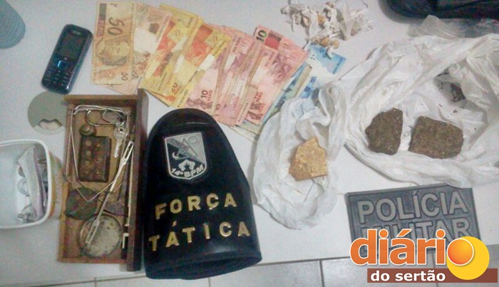 Uma guarnição da Força Tática composta pelo Sargento Silva, Cabo Aladim e os soldados Guedes e Márcio realizavam rondas pela cidade quando avistaram o suspeito entrando na casa. Os policiais entraram na residência e encontraram 15 pedras de crack, 30g de maconha e uma quantia de R$ 362 em dinheiro.