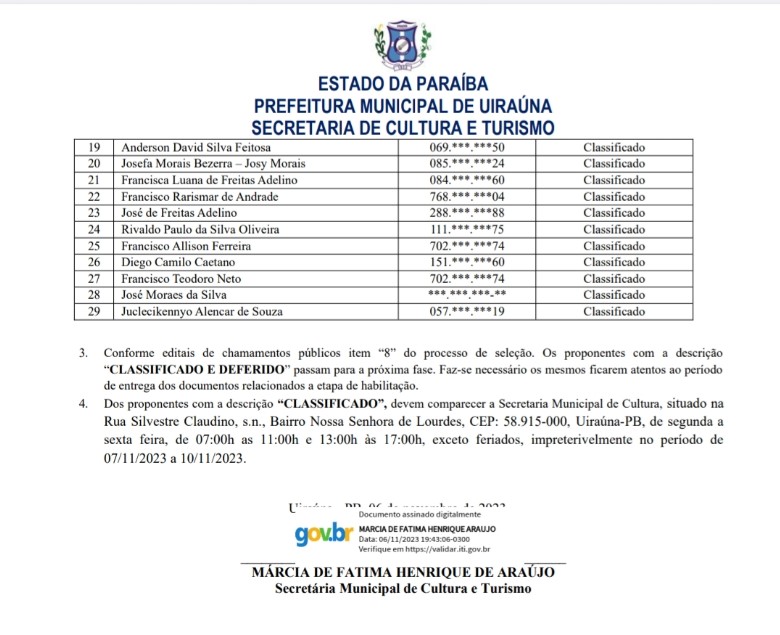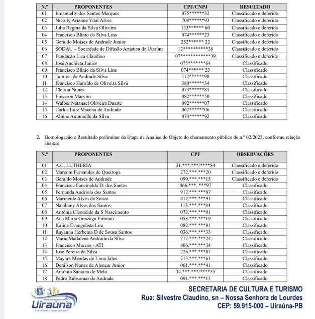 Prefeita Municipal de Uiraúna, por meio da Secretaria Municipal de Cultura e Turismo, juntamente com a Comissão de Acompanhamento, Avaliação e Seleção da Lei Paulo Gustavo em âmbito municipal, em consonância com a Lei Complementar nº 195, de 8 de julho de 2022; o Decreto Federal nº 11.525, de 11 de maio de 2023; o Decreto Federal nº 11.453, de 23 de março de 2023; o Decreto Municipal nº 034, de 03 de outubro de 2023, com fundamento do item “6” dos editais de chamamento público de n.º 01 e 02, vem ao público divulgar:
