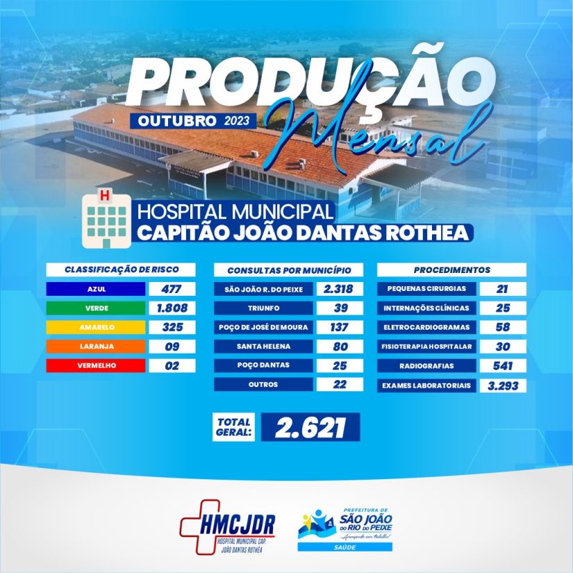 “Nesse mês de outubro, no total em São João do Rio do Peixe, foram atendidos 2.318 usuários do SUS do município de São João. Tivemos ainda, da cidade de Triunfo 39 pessoas, da cidade de Poço José de Moura 137, já da cidade de Santa Helena foram 80, da cidade de Poço Dantas 25. Outro municípios polarizados, dentro do Vale do Rio do Peixe, são 22 no total. Somando todos os atendimentos, tem 2.621 pessoas que foram atendidas”, disse o repórter.