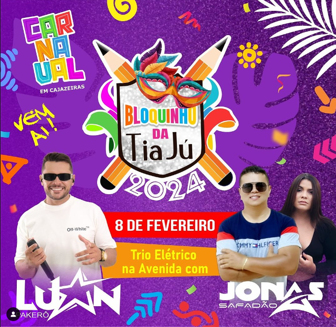 “Mais um ano o Bloquinho da Tia Jú estará na avenida. Esse ano estaremos com dois trios eletricos na avenida, então venho aqui deixar o convite a toda população de Cajazeiras. Dia 08 de fevereiro o Bloquinho da Tia Jú estará na avenida com dois trios eletricos, com Jonas Safadão e Luan Pakerô”, ressaltou Juliana.