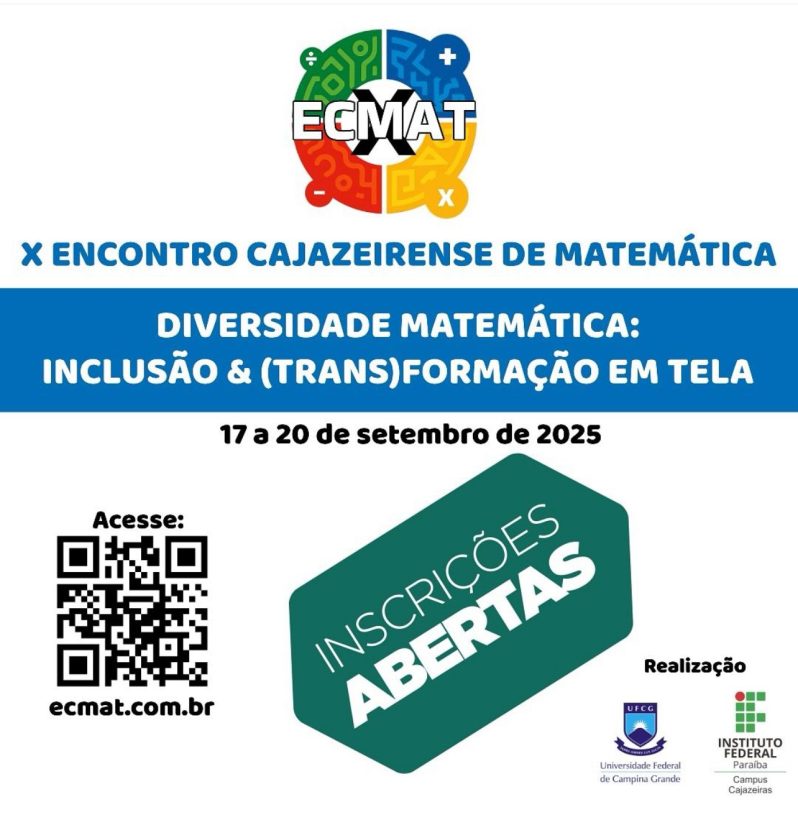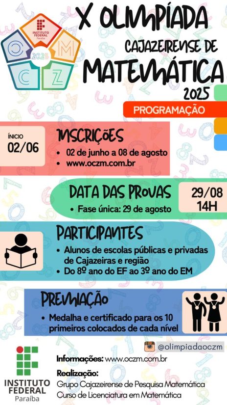 O prazo para as inscrições na X Olimpíada Cajazeirense de Matemática termina nesta sexta-feira, 08 de agosto. A competição, que celebra uma década de existência, é uma realização do Grupo Cajazeirense de Pesquisa Matemática junto ao curso de Licenciatura em Matemática do Instituto Federal da Paraíba (IFPB), campus Cajazeiras, e é aberta a estudantes de escolas públicas e privadas.
