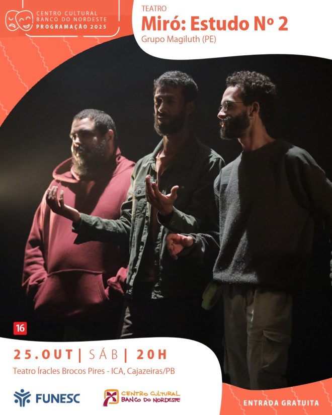 O Grupo Magiluth, de Pernambuco, desembarca em Cajazeiras neste sábado (25) para apresentar o seu décimo segundo trabalho: o espetáculo “Miró: Estudo N° 2”, uma jornada inspirada na obra do poeta Miró da Muribeca.