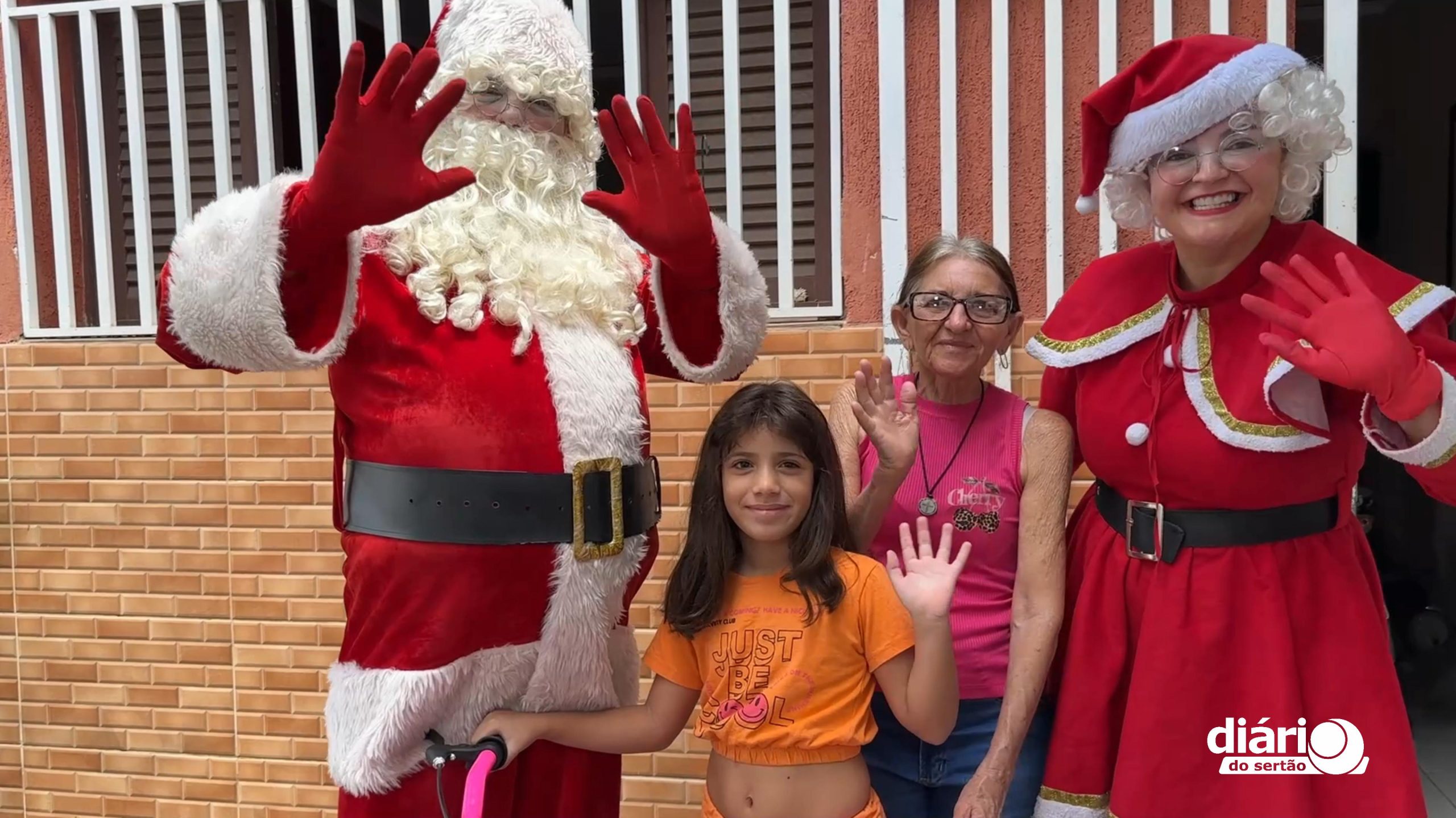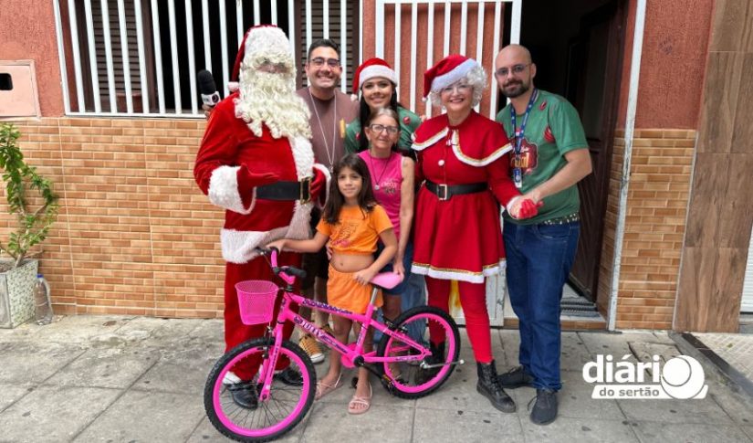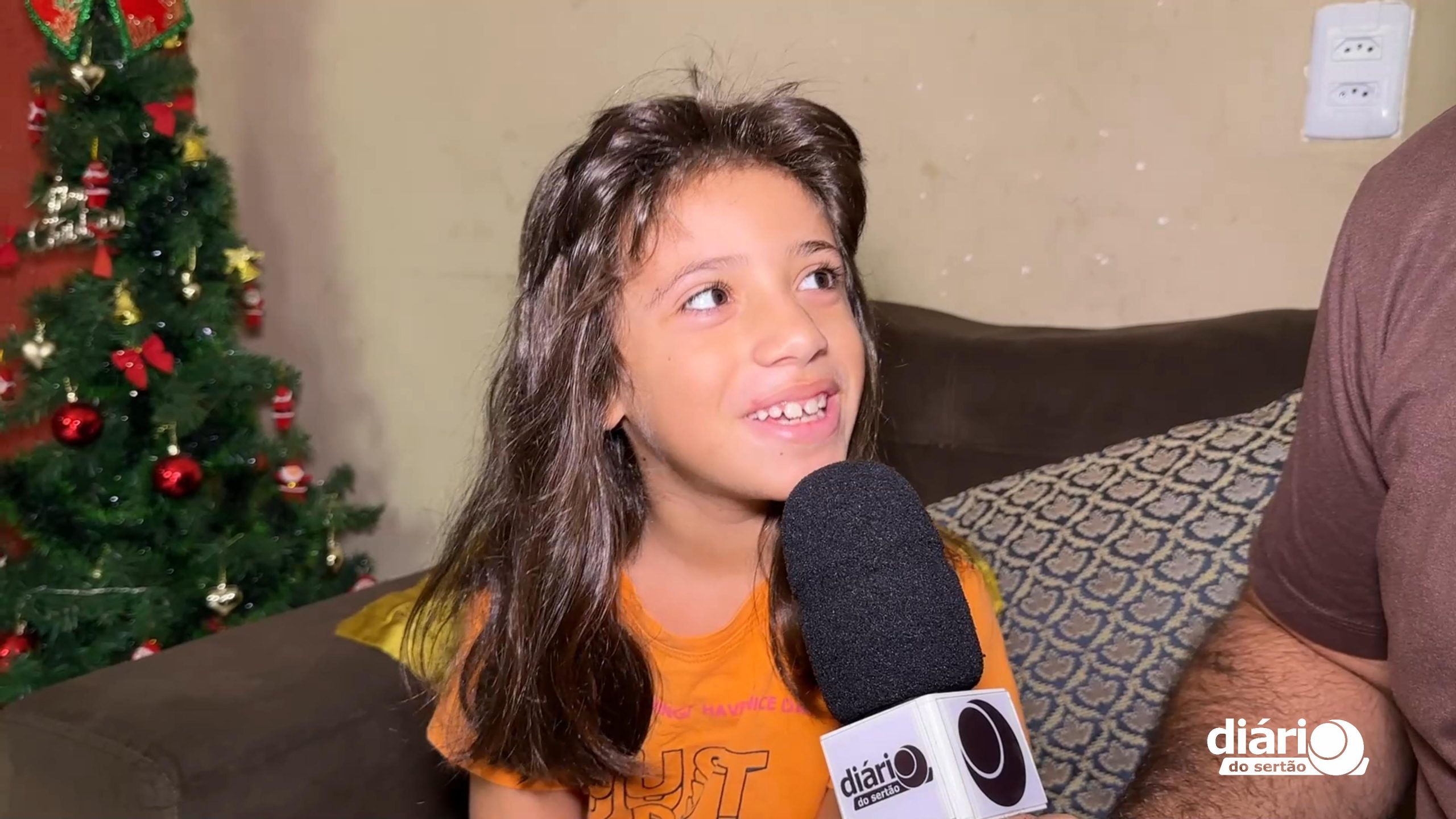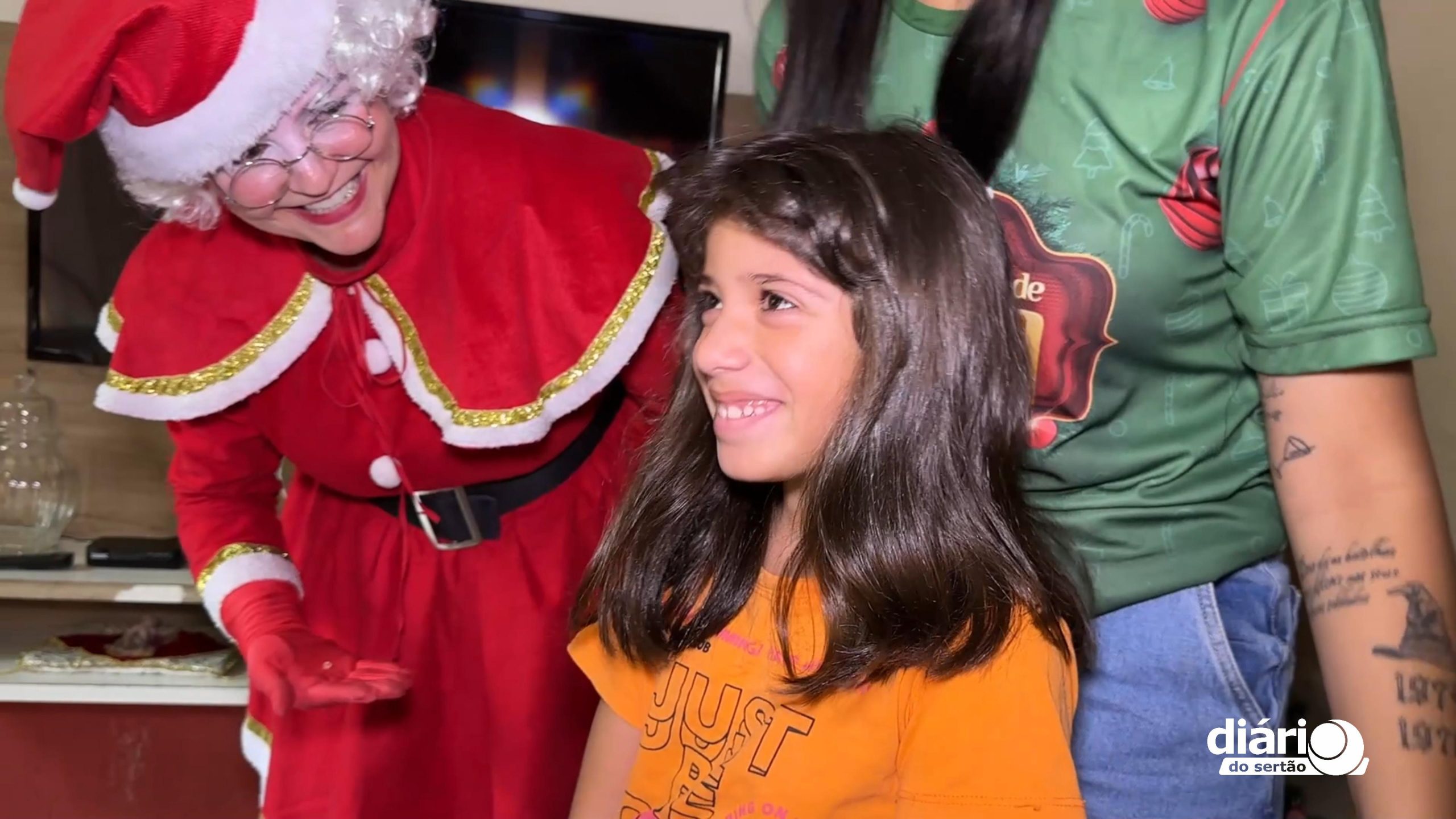 Alice Cavalcante tem 7 anos e recebeu a visita surpresa do Papai e da Mamãe Noel da ação "Sonho de Natal", uma iniciativa do Lojão Rio do Peixe e TV Diário do Sertão