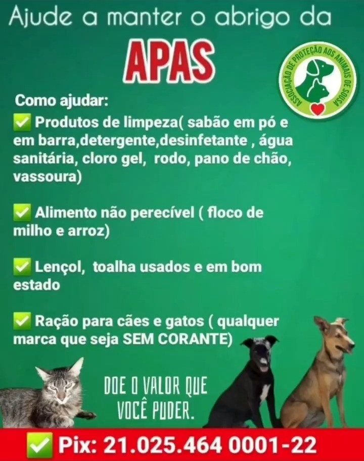 Para ajudar os animais da APAS, veja as informações no cartaz abaixo ou entre em contato pelo Instagram da ONG: @apas_sousa