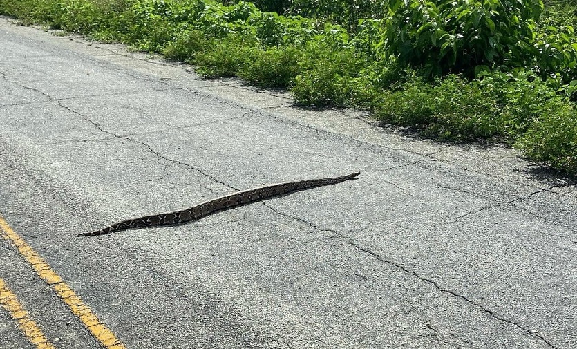 Uma cobra da espécie jiboia, com cerca de 2 metros de comprimento, foi vista essa semana na estrada que dá acesso à comunidade Vila do Brejo, zona rural do município de São João do Rio do Peixe, no Sertão da Paraíba.