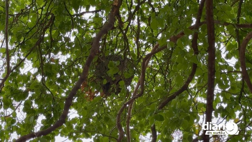 Padre Francivaldo Albuquerque, que também é produtor rural e dono da propriedade, mostrou para a TV Diário do Sertão os enxus no alto de um juazeiro, às margens do sangradouro do açude que abastece o sítio e pereniza um riacho.