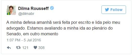 “A minha defesa amanhã (6) será feita por escrito e lida pelo meu advogado. Estamos avaliando a minha ida ao plenário do Senado, em outro momento”, escreveu a presidente.