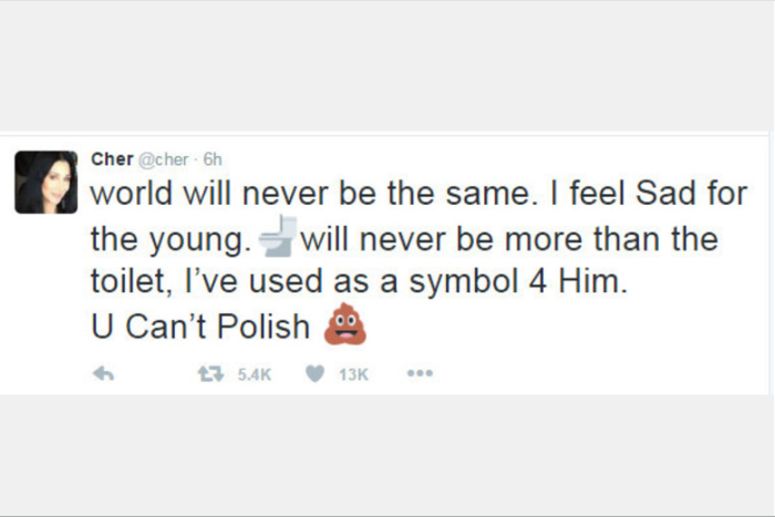 Após a vitória do republicano, Cher soltou essa: “O mundo nunca mais vai ser o mesmo novamente. Trump [ela usa o símbolo de uma privada para se referir a ele] nunca será mais do que a privada que uso para representá-lo. Não dá para arrumar”