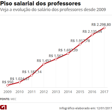 Veja abaixo a evolução do piso salarial dos professores desde 2009: