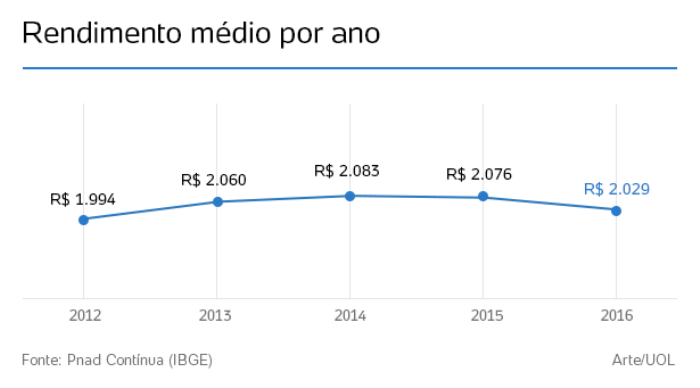 No quarto trimestre de 2016, o rendimento dos trabalhadores foi de R$ 2.043. Apesar de maior do que no terceiro trimestre (R$ 2.026) e do que no mesmo período de 2015 (R$ 2.033), o resultado é considerado estável pelo IBGE nas duas comparações.