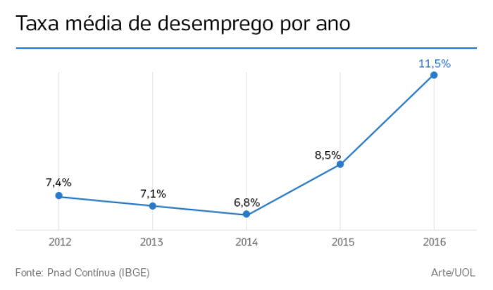 O Brasil fechou 2016 com 11,8 milhões de desempregados, em média, o que representa um aumento de 37% na comparação com 2015, quando eram 8,6 milhões. É o maior registrado pela pesquisa, que começou a ser feita em 2012.