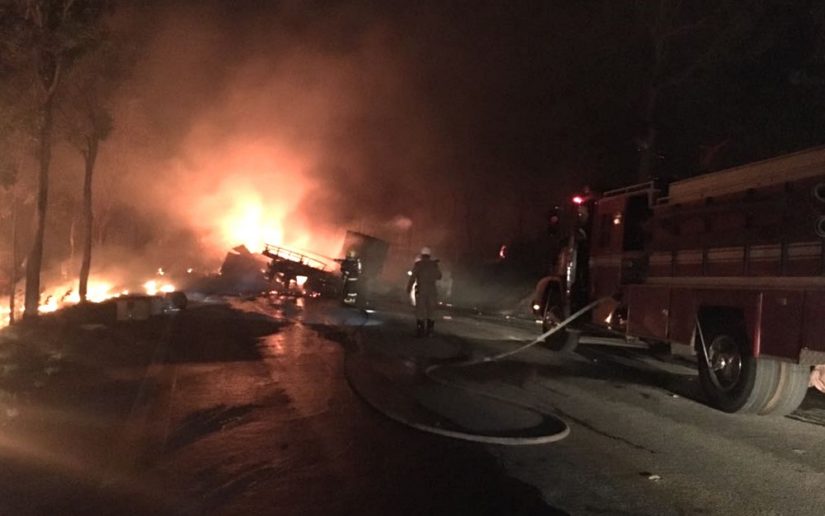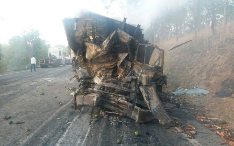 Segundo a PRF, colisão envolveu 8 veículos de carga e um de passeio, que pegaram fogo logo em seguida; vítimas foram carbonizadas. Trecho da pista está completamente interditado.