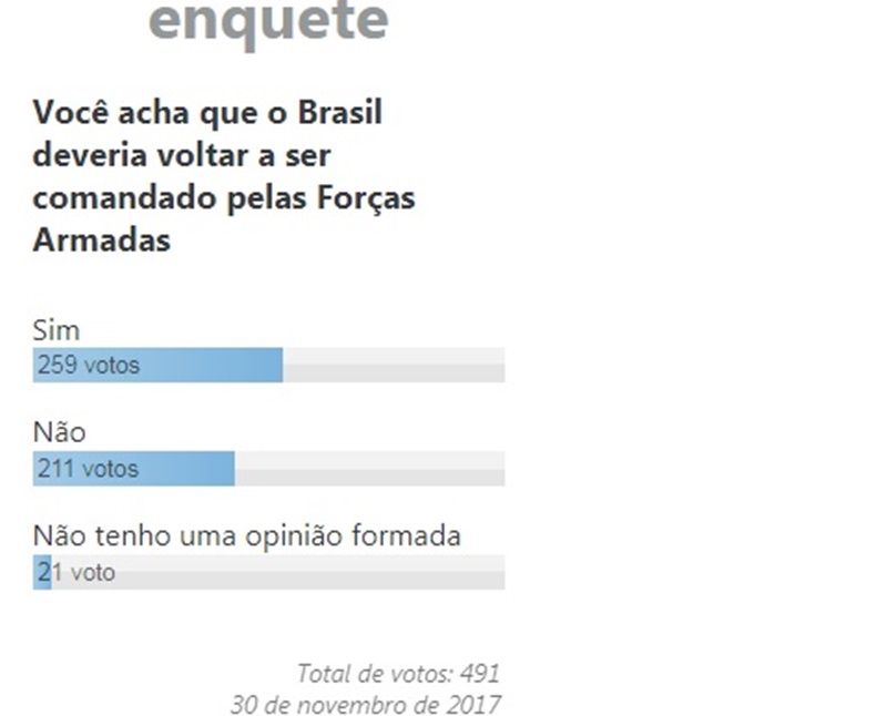 Desta enquete, 491 votos foram computados. A pergunta feita aos internautas foi a seguinte: Você acha que o Brasil deveria voltar a ser comandado pelas Forças Armadas?
