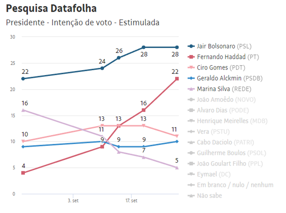 NOVA PESQUISA: Haddad sobe a 22%; Bolsonaro tem 28% e Ciro cai para 11%, diz Datafolha