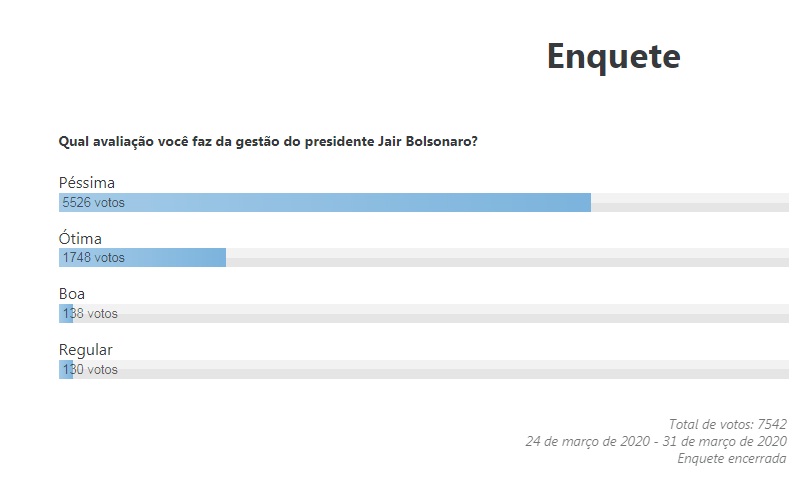 Num total de 7.542 votos, 1.748 avaliaram como ótima, 138 como boa e 130 como regular. A enquete ficou no ar de 24 de março a 31 de março de 2020.