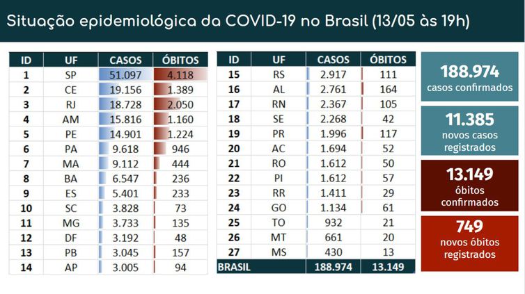O Brasil teve 749 novas mortes registradas nas últimas 24h e chegou a 13.149. O resultado representou um aumento de 6% em relação a ontem, quando foram contabilizados 12,4 mil falecimentos pela covid-19. O balanço diário foi divulgado no início da noite desta quarta-feira (13) pelo Ministério da Saúde.