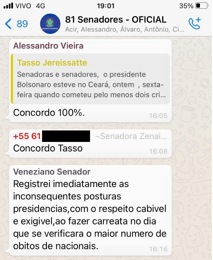 A coluna do jornalista Guilherme Amado na Revista Época teve acesso a prints de mensagens trocadas neste sábado (27) em um grupo de WhatsApp que reúne 81 senadores, onde uma parte deles – inclusive integrantes da base aliada – criticaram a postura do presidente Jair Bolsonaro (sem partido) diante da pandemia do novo coronavírus e defenderam a necessidade de criar uma Comissão Parlamentar de Inquérito (CPI) que pode resultar em impeachment.