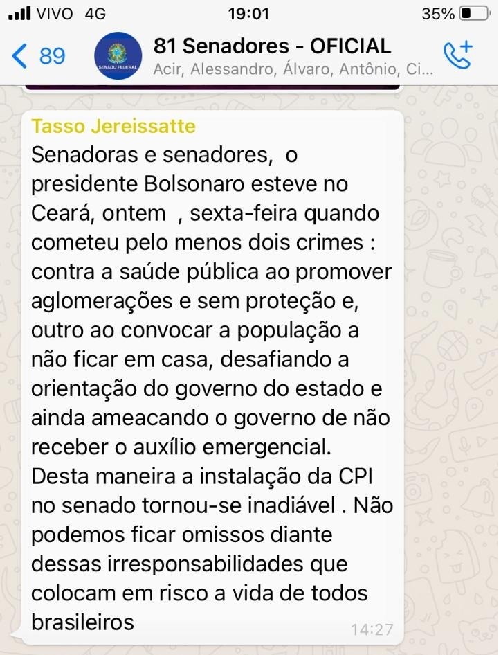 “Senadoras e senadores, o presidente Bolsonaro esteve no Ceará, ontem, sexta-feira, quando cometeu pelo menos dois crimes contra a saúde pública, ao promover aglomerações sem proteção e ao convocar a população a não ficar em casa, desafiando a orientação do Governo do Estado e ainda ameaçando o governo de não receber o auxílio emergencial. Desta maneira, a instalação da CPI no Senado tornou-se inadiável. Não podemos ficar omissos diante dessas irresponsabilidades que colocam em risco a vida de todos brasileiros”, escreveu Jereissati.