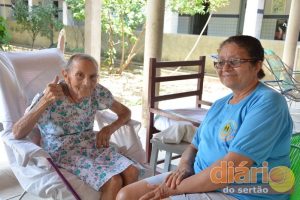 A diretora do abrigo, Fátima Cruz, ao lado de dona Umbelina, de 116 anos