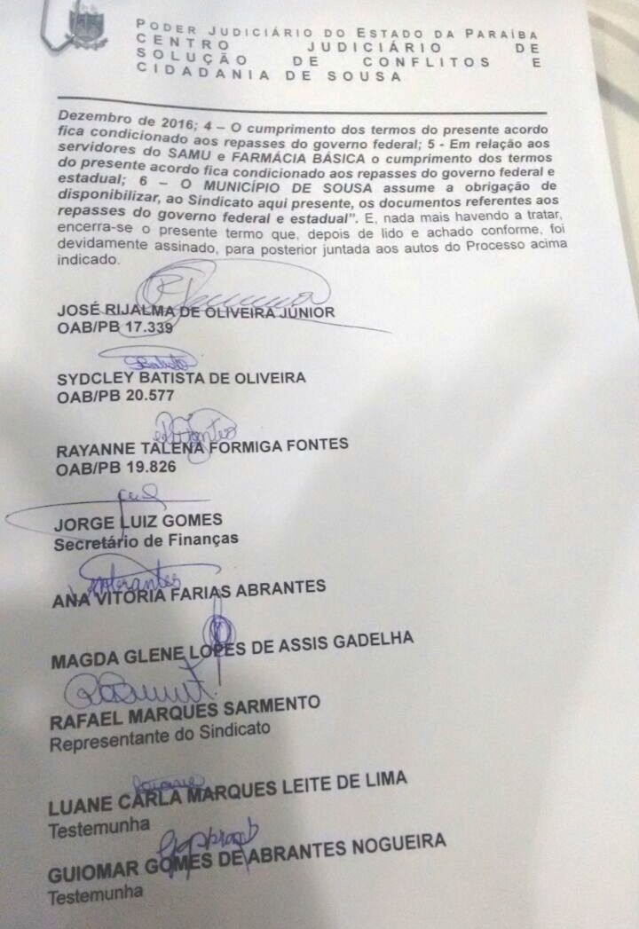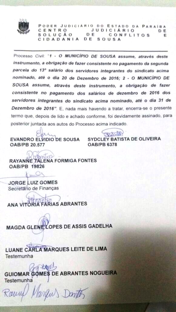 Durante a reunião, ficou acordado através de um termo de audiência de conciliação que a prefeitura de Sousa realizará o pagamento da segunda parcela do 13º salário dos servidores integrantes do referido sindicato até o dia 20 de dezembro. Já o pagamento do mês de dezembro, a prefeitura tem até o dia 31 para realizar o pagamento.