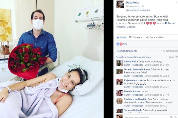 Myllena é noiva com o médico sousense Doca Neto que postou neste sábado (17) em sua página pessoal no Facebook, uma mensagem, onde segundo ele, foram realizados exames em um hospital de Recife que confirmaram chances de cura do câncer de Myllena: