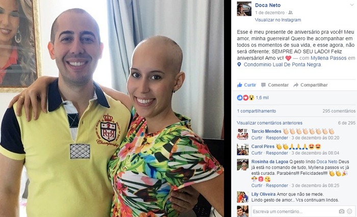 Uma das imagens mais compartilhadas do casal foi publicada no dia 1° de dezembro, onde Doca Neto decidiu raspar o cabelo para homenagear Myllena: “Esse é meu presente de aniversário pra você! Meu amor, minha guerreira”, disse ele: