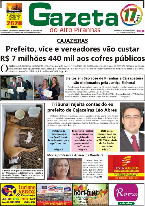 O jornal Gazeta do Alto Piranhas circula todas as sextas-feiras, na cidade de Cajazeiras e região, para assinar ou comprar: (83) 3531-1535 Leia mais notícias no www.diariodosertao.com.br, siga nas redes sociais: Facebook, Twitter, Instagram e veja nossos vídeos no Play Diário. Envie informações à Redação pelo WhatsApp (83) 99157-2802.