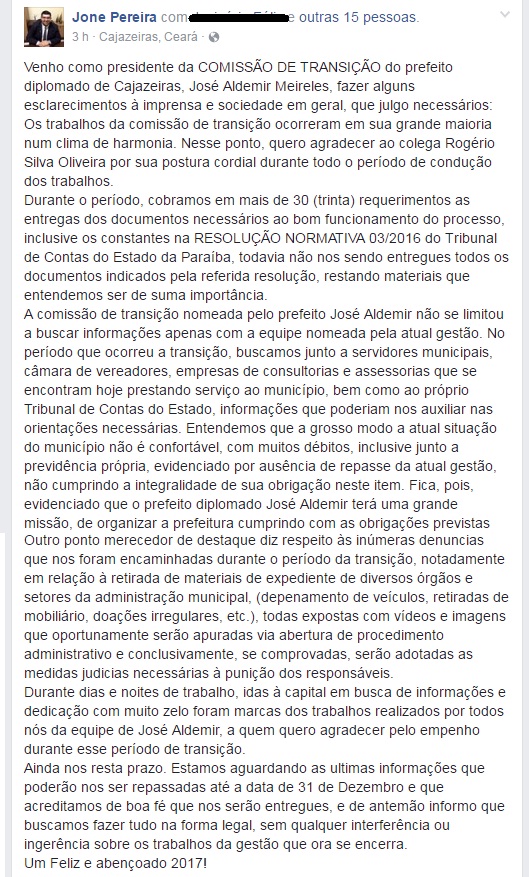 O advogado Jone Pereira, que é presidente da Comissão de Transição do prefeito eleito e já diplomado de Cajazeiras, José Aldemir Meireles (PP), publicou no seu Facebook, na noite desta quinta-feira, uma espécie de nota de esclarecimento em que denuncia uma suposta situação de descaso, desmando e ilegalidades na prefeitura que estaria inviabilizando a conclusão da transição de governo. Entre os problemas revelados pelo advogado estão dívidas em vários órgãos, o não repasse de documentos para a transição, ‘desmanche’ nas repartições e ‘depenação’ de automóveis.