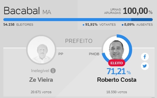Na eleição do último dia 2 de outubro, Zé Vieira foi o mais votado obtendo 20.671 votos. O deputado estadual Roberto Costa ficou em segundo com 18.330, e, no portal oficial do TSE, ele ainda aparece como o prefeito eleito, já que 71,21% dos votos válidos foram dados a ele.