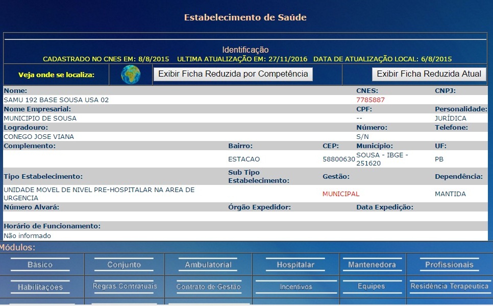 Cadastro da USA02 do SAMU de Sousa (foto: ministério da saúde)