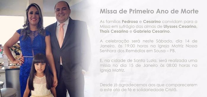 As famílias Pedrosa e Cesarino convidam para a Missa em sufrágio das almas de Ulysses Cesarino, Thaís Cesarino e Gabriela Cesarino.