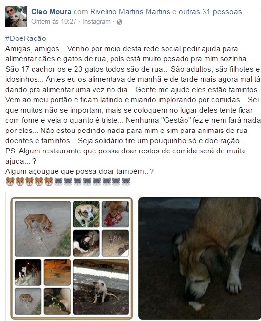 A defensora dos animais em Cajazeiras, Cleo Pires, usou sua página na rede social do Facebook nessa terça-feira (14), para pedir doações de ração, para alimentar 17 cachorros e 23 gatos de rua, que chegam todos os dias a residência em busca de comida.