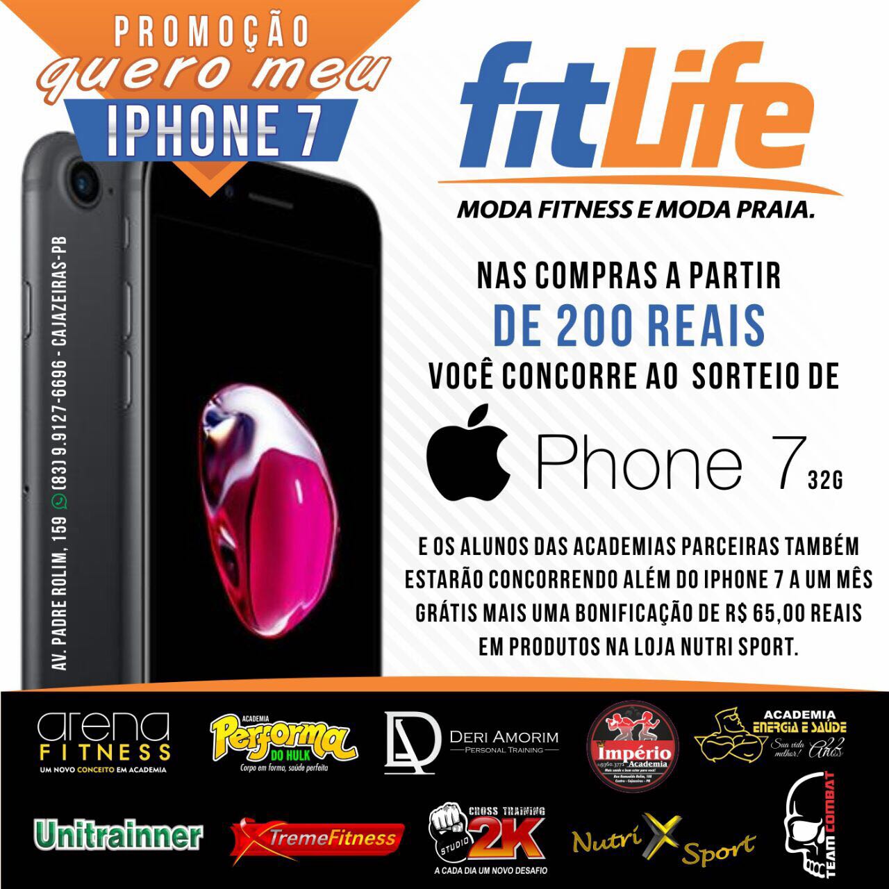 A sensação em roupas e acessórios fitness de Cajazeiras também premia os seus clientes. É isso mesmo! Quer ganhar um super prêmio neste sábado? Ainda dá tempo! Vá até a loja Fitlife, especializada em moda fitness e moda praia, faça uma compra a partir de 200 reais e concorra a um super iPhone 7, um dos smartphones mais desejados pela galera.