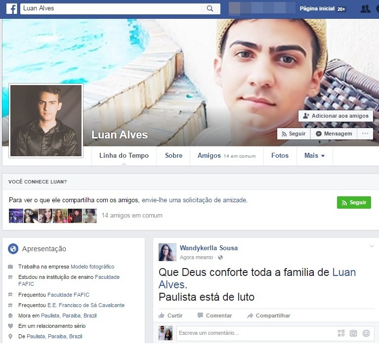 Página oficial do jovem de Paulista (Foto: reprodução)