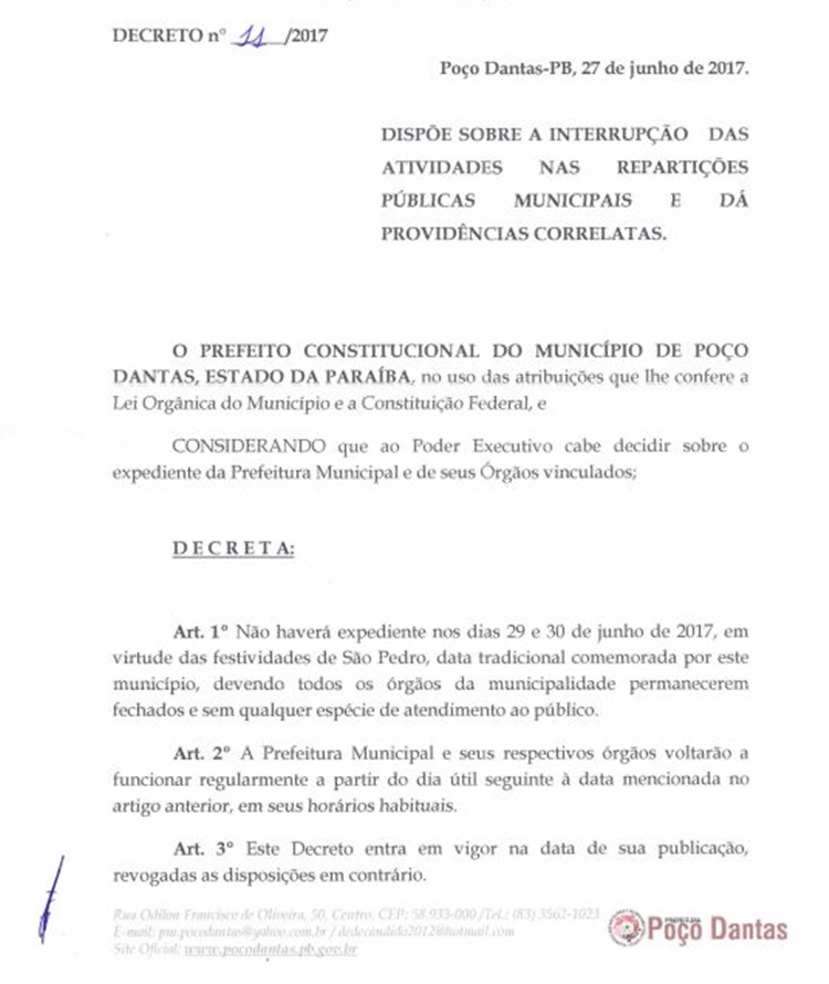 O Prefeito Constitucional de Poço Dantas José Gurgel Sobrinho (Dedé Cândido), decreta suspensão das atividades municipais neste dia 28 de Junho em referência as festividades dia de São Pedro.