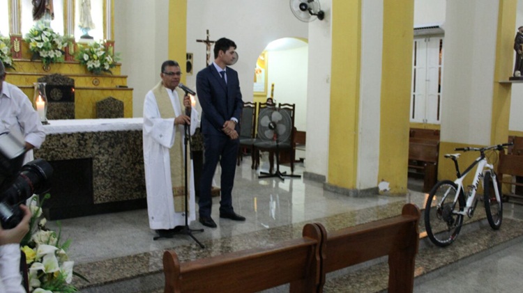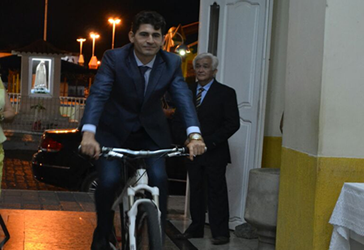 O padre, Nicodemos que celebrou a Missa de cerimônia riu bastante com a atitude irreverente do noivo. Essa é a primeira vez que um noivo vai à igreja de São José de Piranhas de bicicleta.
