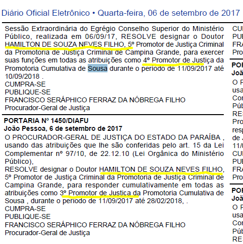 O Diário Oficial do Ministério Público Estadual publicou na quarta-feira (06) a nomeação do Promotor de Justiça Hamilton de Souza Neves Filho para ocupar a 3ª e 4ª promotorias cumulativas de Sousa, substituindo o promotor Valfredo Alves Teixeira que foi afastado recentemente e responde processo administrativo no MP.